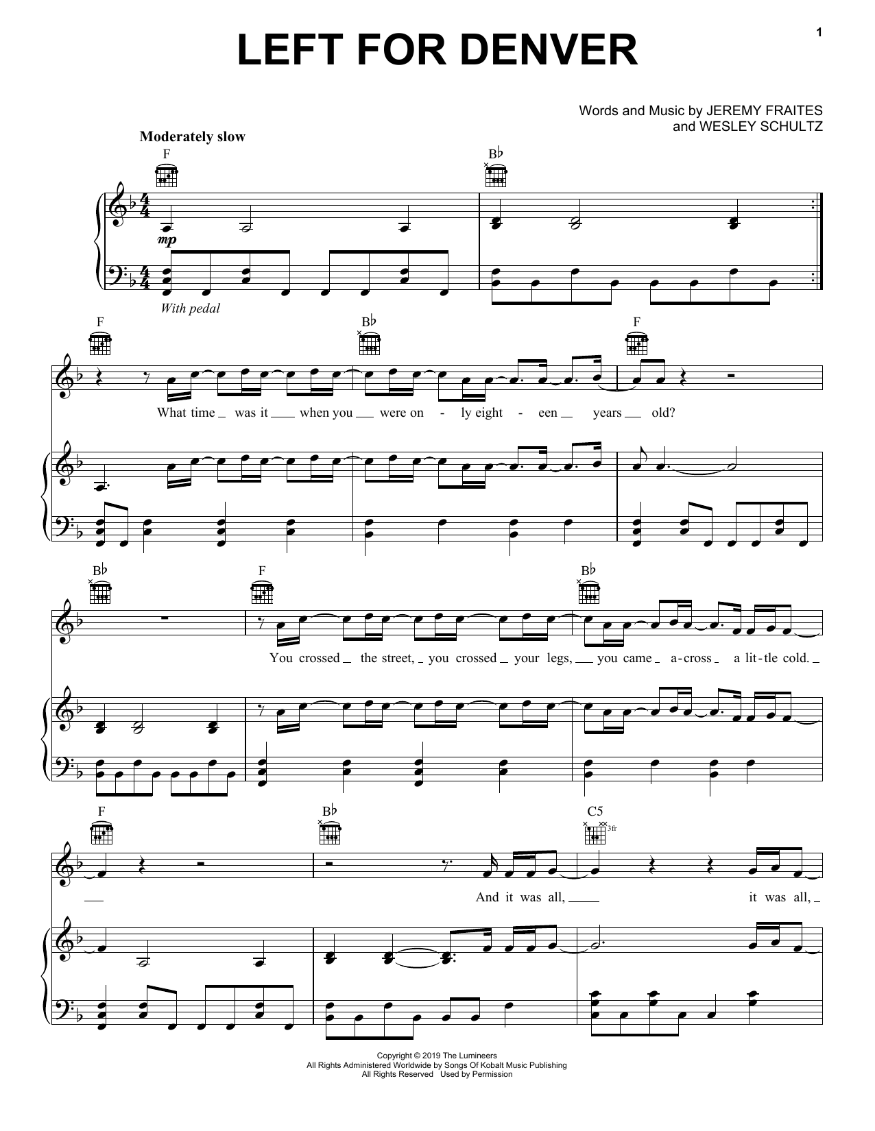 Download or print The Lumineers Left For Denver sheet music, chords and digital score arranged for Piano, Vocal & Guitar Chords (Right-Hand Melody). This Folk score includes 4 page(s).