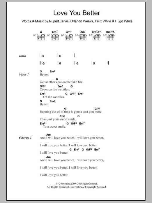 Download or print The Maccabees Love You Better sheet music, chords and digital score arranged for Guitar Chords/Lyrics. This Rock score includes 3 page(s).