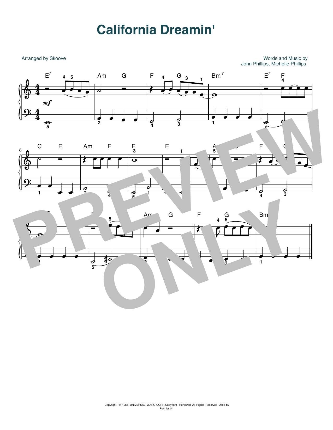 Download or print The Mamas & The Papas California Dreamin' (arr. Skoove) sheet music, chords and digital score arranged for Beginner Piano (Abridged). This Pop score includes 1 page(s).