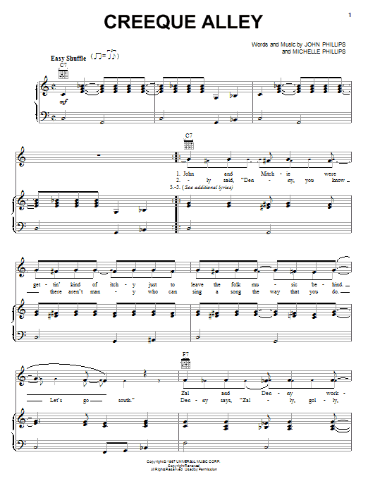 Download or print The Mamas & The Papas Creeque Alley sheet music, chords and digital score arranged for Lead Sheet / Fake Book. This Pop score includes 2 page(s).