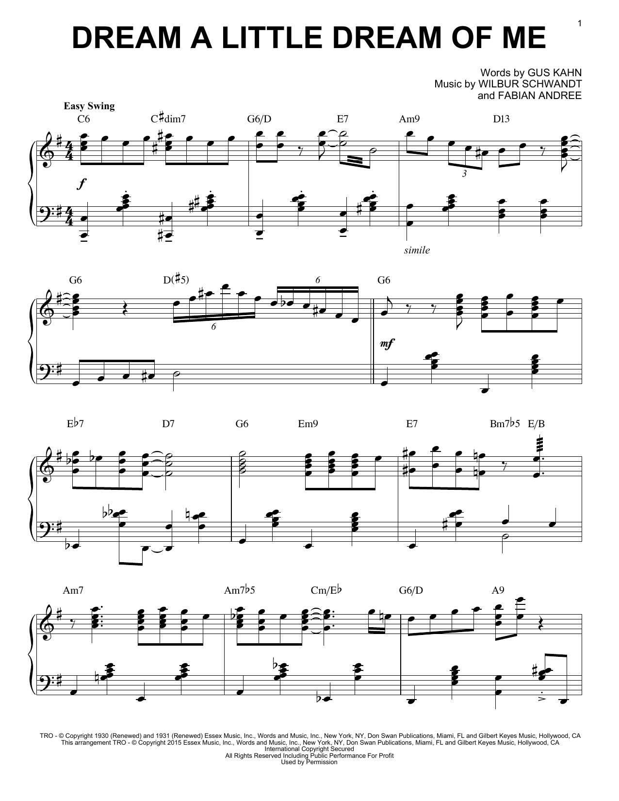 Download or print The Mamas & The Papas Dream A Little Dream Of Me [Jazz version] (arr. Brent Edstrom) sheet music, chords and digital score arranged for Piano & Vocal. This Jazz score includes 4 page(s).
