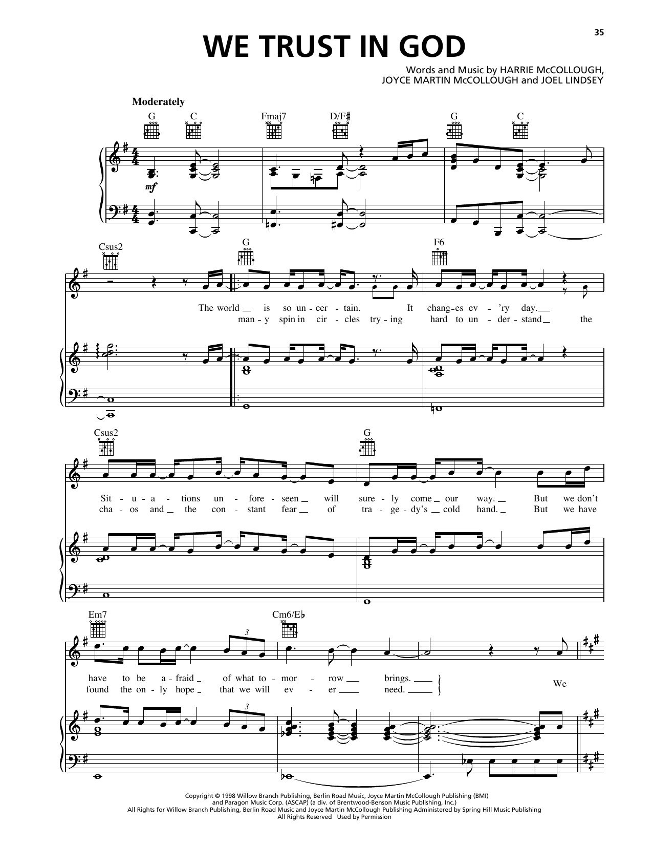 Download or print The Martins We Trust In God sheet music, chords and digital score arranged for Piano, Vocal & Guitar Chords (Right-Hand Melody). This Pop score includes 6 page(s).