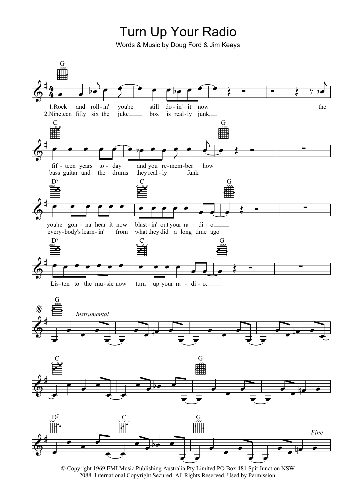 Download or print The Masters Apprentices Turn Up Your Radio sheet music, chords and digital score arranged for Lead Sheet / Fake Book. This Pop score includes 2 page(s).