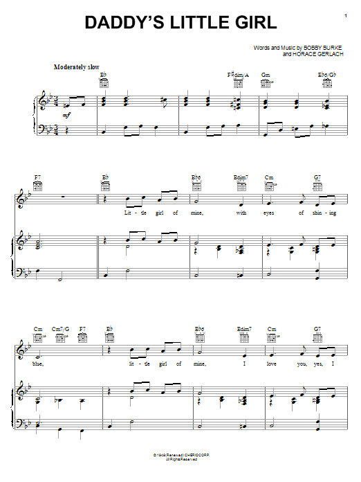 Download or print The Mills Brothers Daddy's Little Girl sheet music, chords and digital score arranged for Piano, Vocal & Guitar Chords (Right-Hand Melody). This Country score includes 4 page(s).