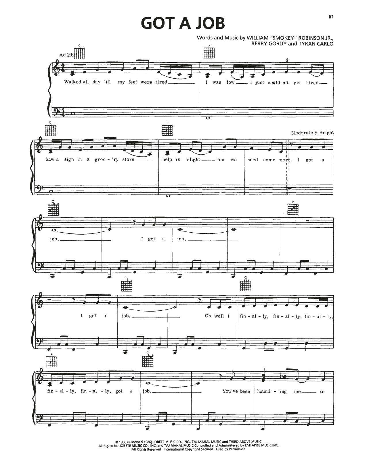 Download or print The Miracles Got A Job sheet music, chords and digital score arranged for Piano, Vocal & Guitar Chords (Right-Hand Melody). This Pop score includes 3 page(s).