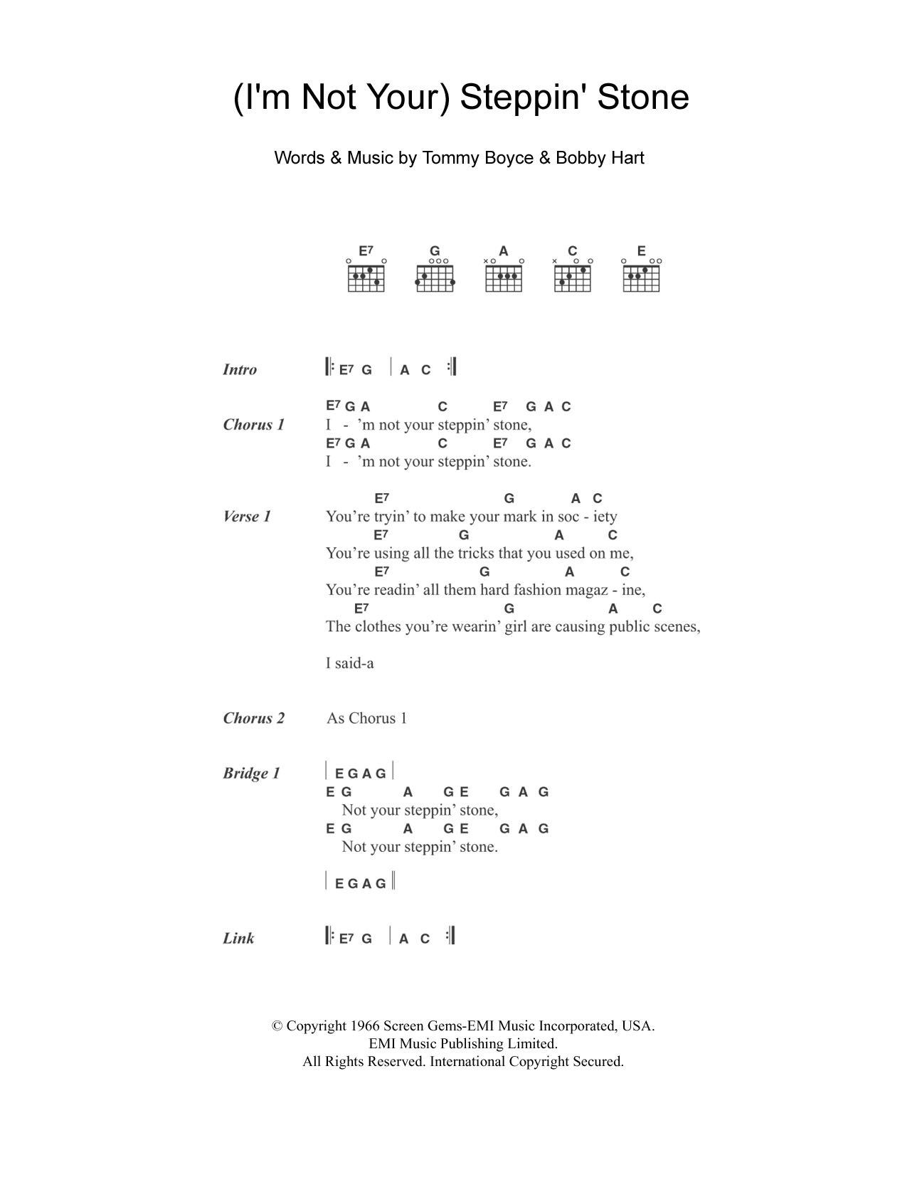 Download or print The Monkees (I'm Not Your) Steppin' Stone sheet music, chords and digital score arranged for Piano, Vocal & Guitar Chords (Right-Hand Melody). This Pop score includes 3 page(s).