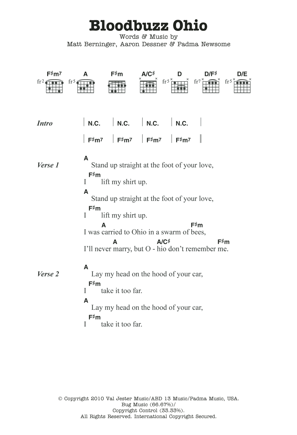 Download or print The National Bloodbuzz Ohio sheet music, chords and digital score arranged for Guitar Chords/Lyrics. This Pop score includes 2 page(s).