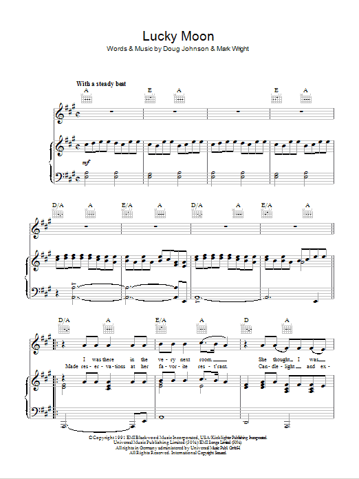 Download or print Oak Ridge Boys Lucky Moon sheet music, chords and digital score arranged for Piano, Vocal & Guitar Chords. This Country score includes 5 page(s).