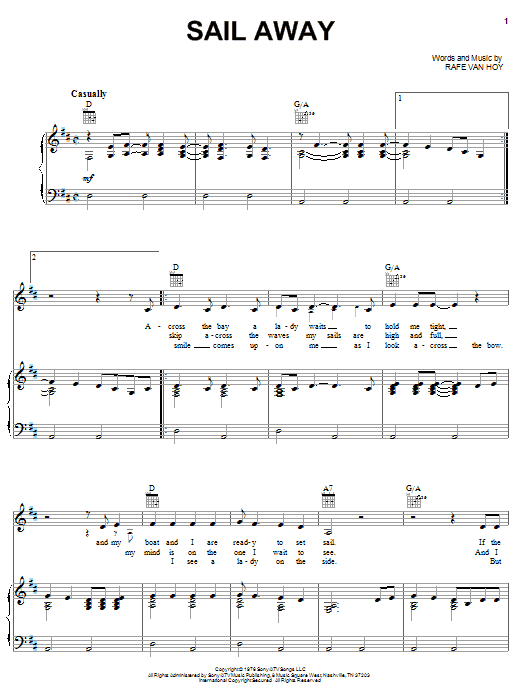 Download or print Oak Ridge Boys Sail Away sheet music, chords and digital score arranged for Piano, Vocal & Guitar Chords (Right-Hand Melody). This Country score includes 3 page(s).