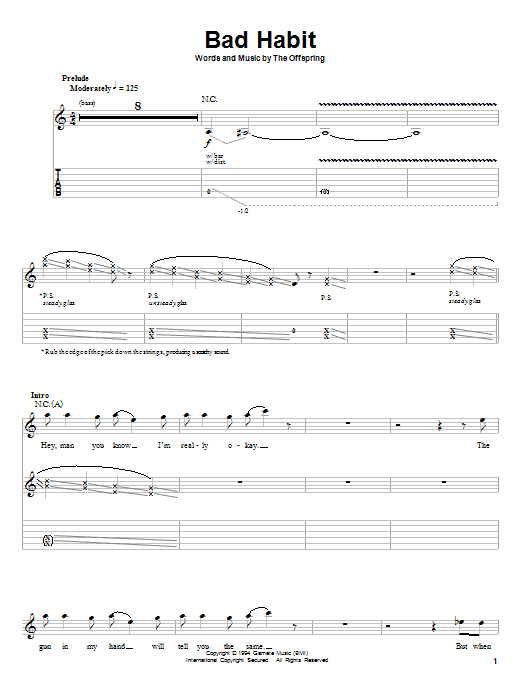 Download or print The Offspring Bad Habit sheet music, chords and digital score arranged for Guitar Tab (Single Guitar). This Metal score includes 7 page(s).