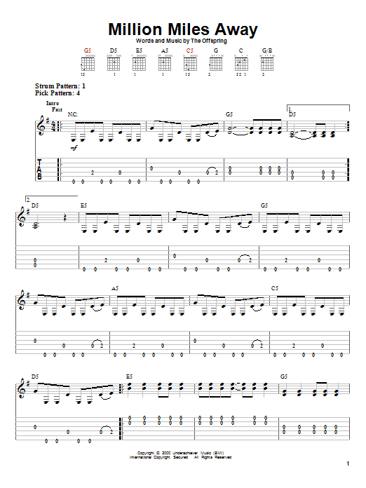 Download or print The Offspring Million Miles Away sheet music, chords and digital score arranged for Guitar Tab (Single Guitar). This Metal score includes 8 page(s).