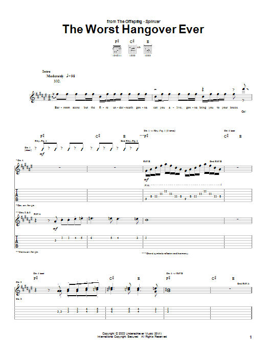Download or print The Offspring The Worst Hangover Ever sheet music, chords and digital score arranged for Guitar Tab. This Metal score includes 4 page(s).