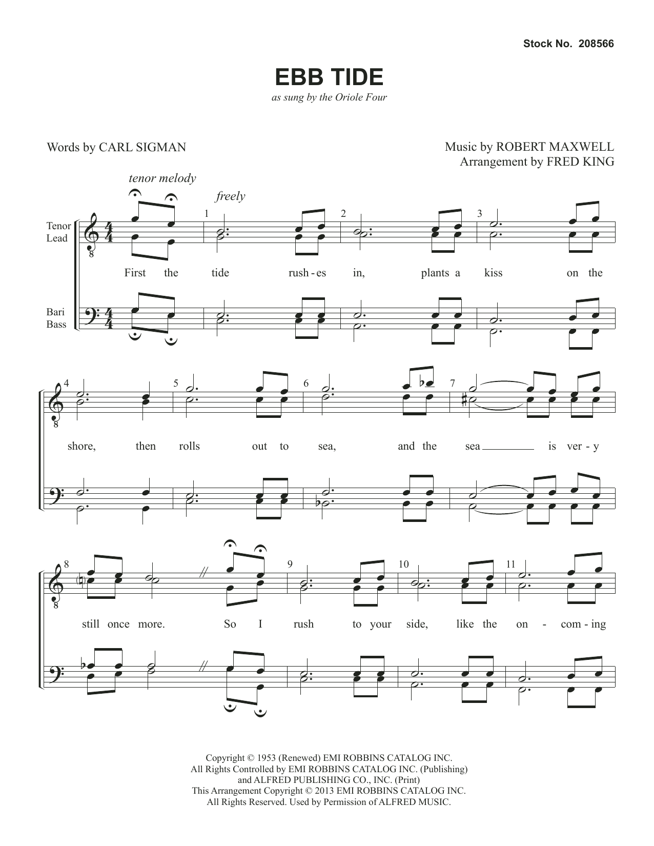 Download or print The Oriole Four Ebb Tide (arr. Fred King) sheet music, chords and digital score arranged for SSAA Choir. This Barbershop score includes 3 page(s).