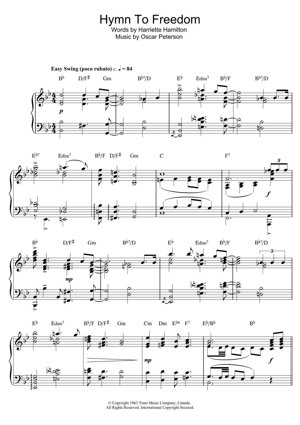 Download or print The Oscar Peterson Trio Hymn To Freedom sheet music, chords and digital score arranged for Piano Solo. This Jazz score includes 10 page(s).