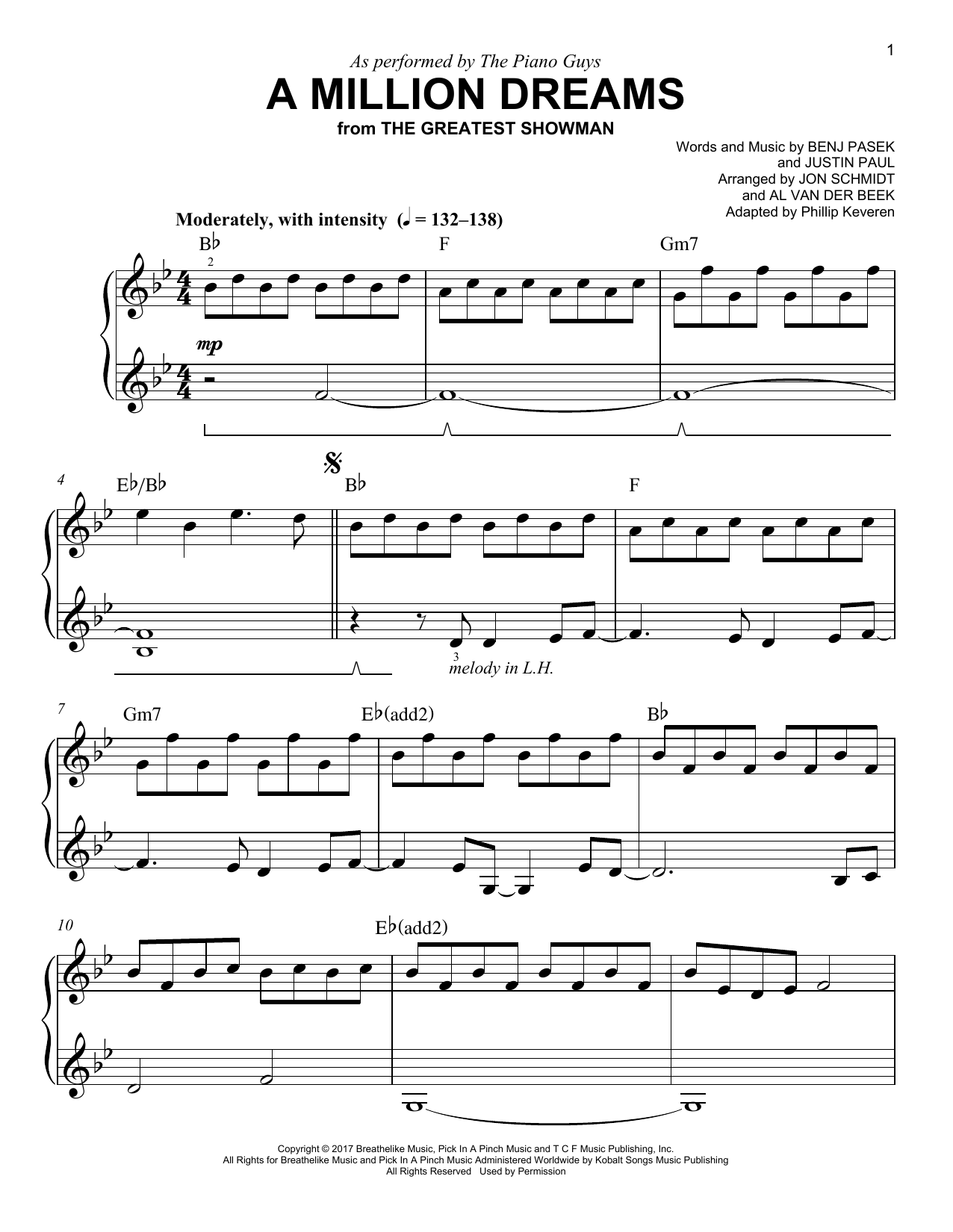 Download or print The Piano Guys A Million Dreams (arr. Phillip Keveren) sheet music, chords and digital score arranged for Easy Piano. This Pop score includes 5 page(s).