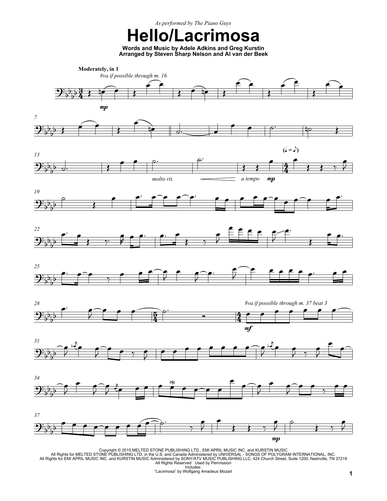 Download or print The Piano Guys Hello/Lacrimosa sheet music, chords and digital score arranged for Cello and Piano. This Pop score includes 7 page(s).