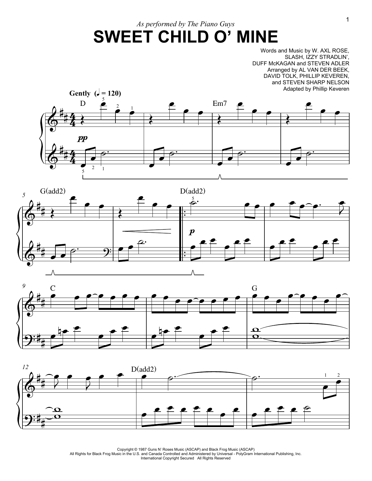 Download or print The Piano Guys Sweet Child O' Mine (arr. Phillip Keveren) sheet music, chords and digital score arranged for Easy Piano. This Rock score includes 3 page(s).