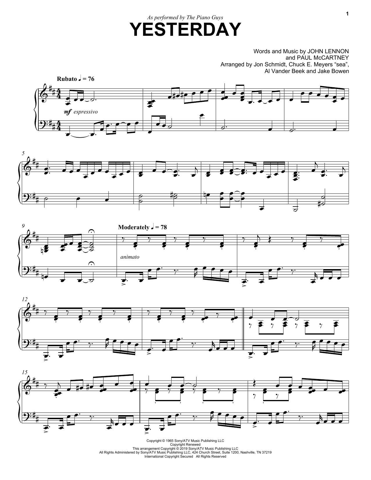Download or print The Piano Guys Yesterday sheet music, chords and digital score arranged for Piano Solo. This Pop score includes 3 page(s).