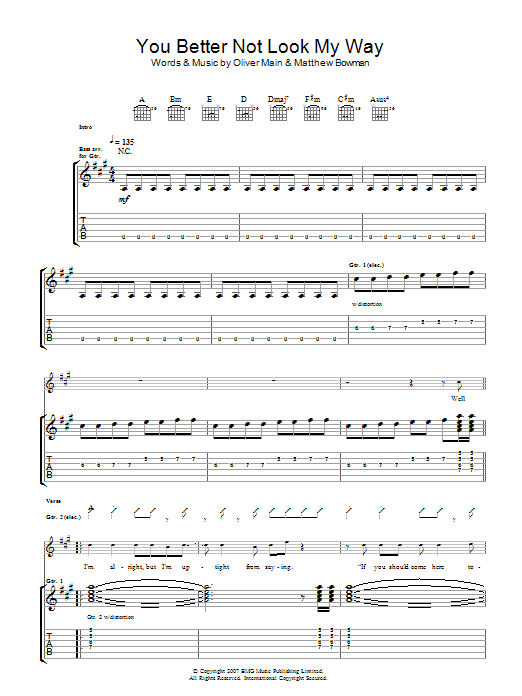 Download or print The Pigeon Detectives You Better Not Look My Way sheet music, chords and digital score arranged for Guitar Tab. This Rock score includes 8 page(s).