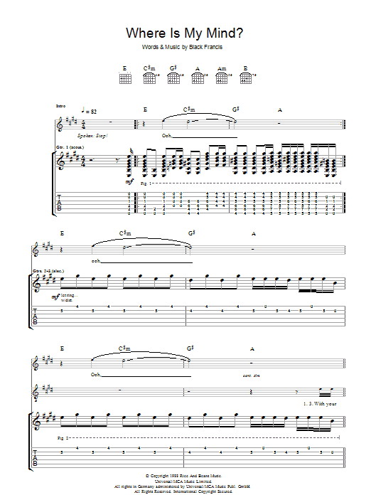 Download or print Pixies Where Is My Mind? sheet music, chords and digital score arranged for Guitar Tab. This Rock score includes 4 page(s).