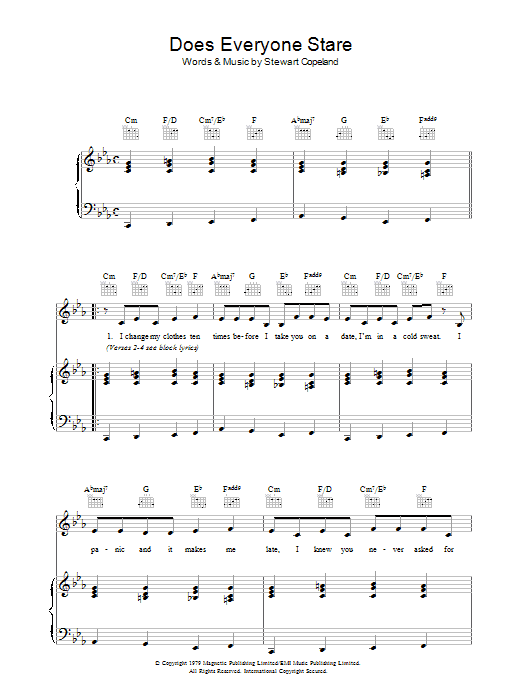 Download or print The Police Does Everyone Stare sheet music, chords and digital score arranged for Guitar Chords/Lyrics. This Rock score includes 2 page(s).