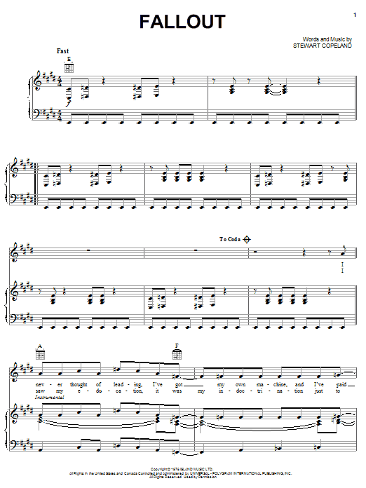 Download or print The Police Fallout sheet music, chords and digital score arranged for Piano, Vocal & Guitar Chords (Right-Hand Melody). This Pop score includes 3 page(s).