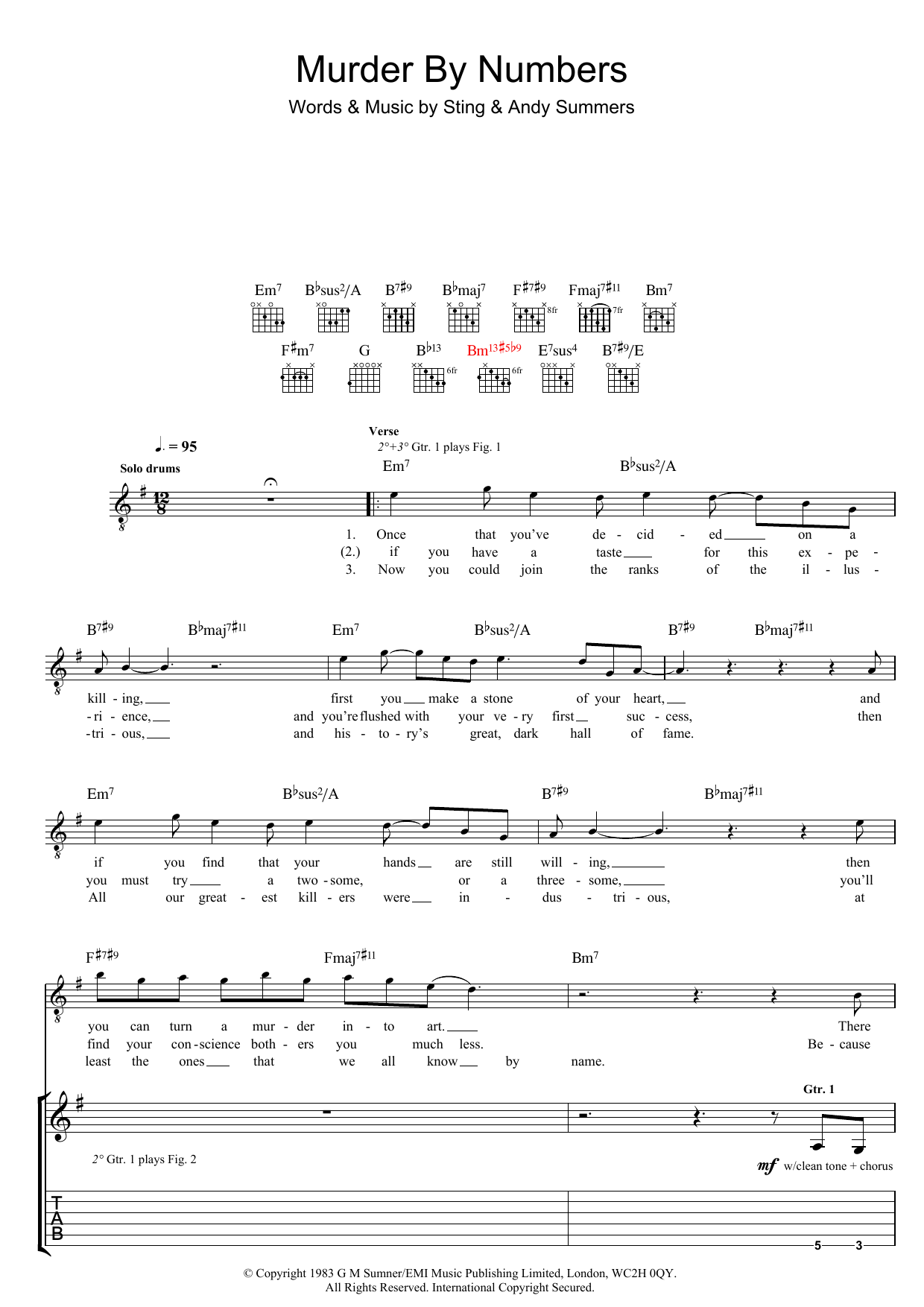 Download or print The Police Murder By Numbers sheet music, chords and digital score arranged for Guitar Chords/Lyrics. This Rock score includes 3 page(s).