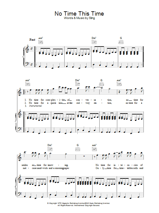 Download or print The Police No Time This Time sheet music, chords and digital score arranged for Guitar Chords/Lyrics. This Rock score includes 2 page(s).