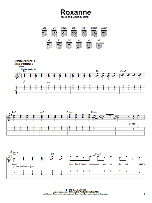 Download or print The Police Roxanne sheet music, chords and digital score arranged for Bass Guitar Tab. This Pop score includes 4 page(s).