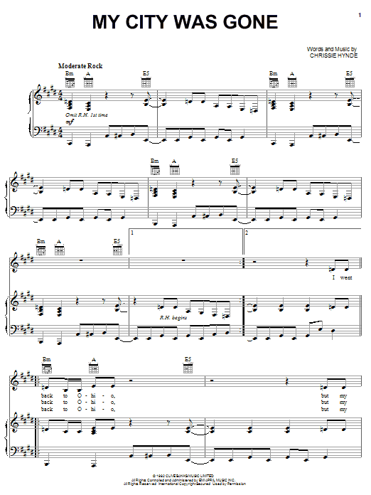 Download or print The Pretenders My City Was Gone sheet music, chords and digital score arranged for Piano, Vocal & Guitar Chords (Right-Hand Melody). This Pop score includes 5 page(s).