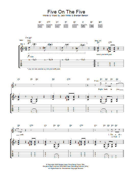Download or print The Raconteurs Five On The Five sheet music, chords and digital score arranged for Guitar Tab. This Rock score includes 6 page(s).