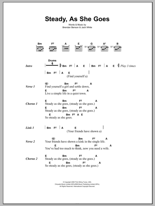 Download or print The Raconteurs Steady, As She Goes sheet music, chords and digital score arranged for Guitar Tab. This Pop score includes 9 page(s).