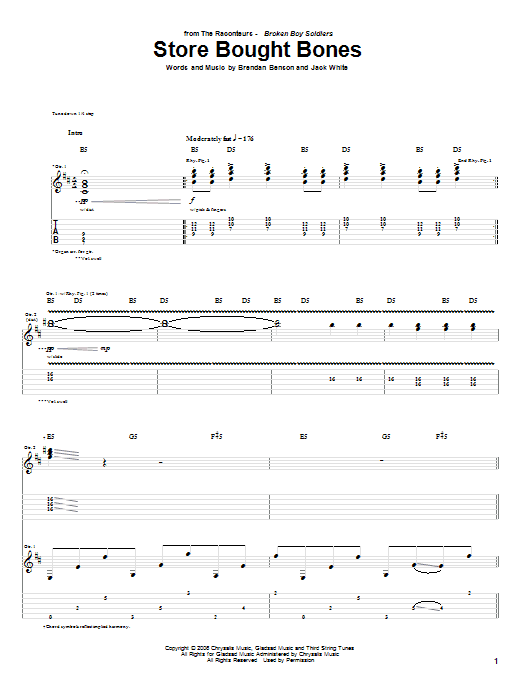 Download or print The Raconteurs Store Bought Bones sheet music, chords and digital score arranged for Guitar Tab. This Pop score includes 9 page(s).