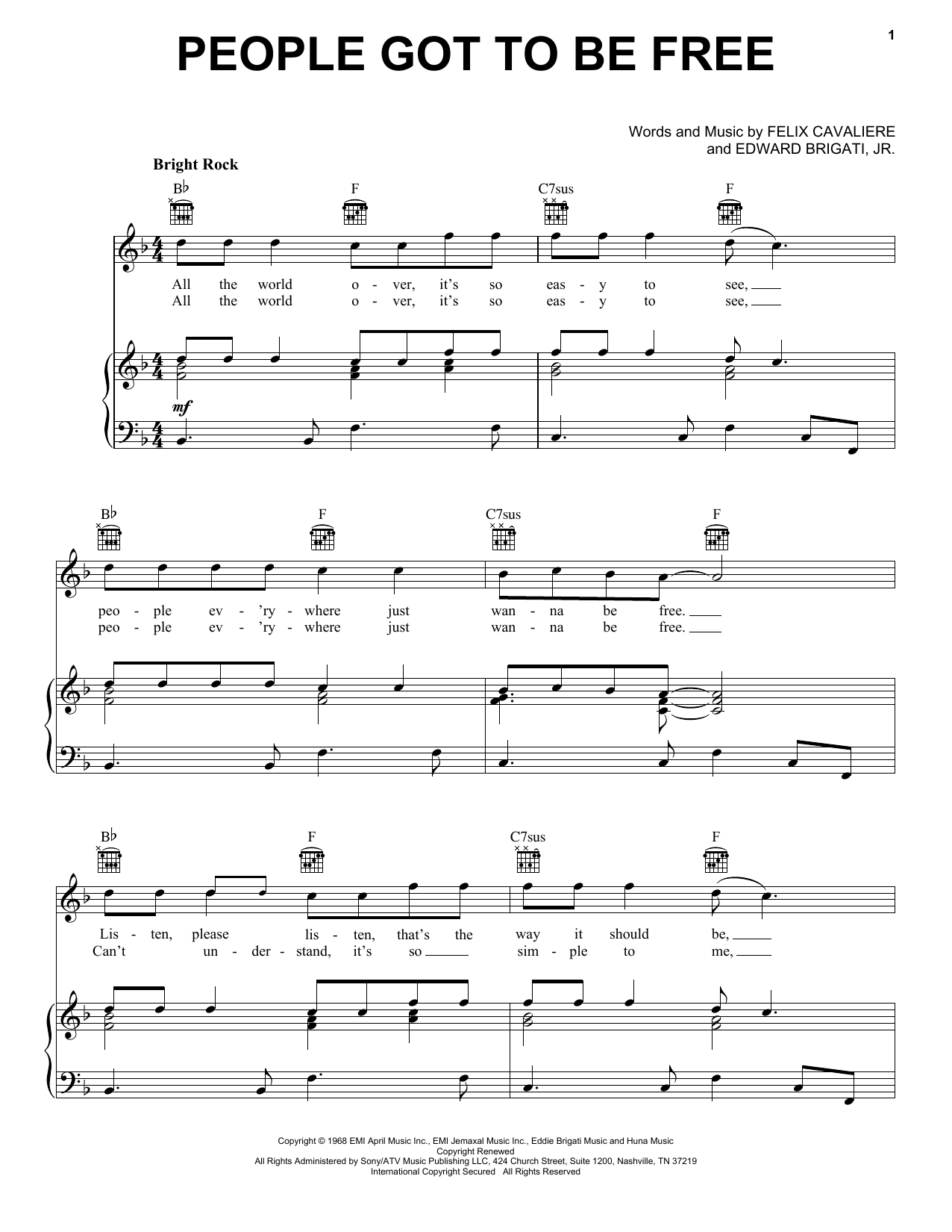 Download or print The Rascals People Got To Be Free sheet music, chords and digital score arranged for Piano, Vocal & Guitar Chords (Right-Hand Melody). This Oldies score includes 5 page(s).