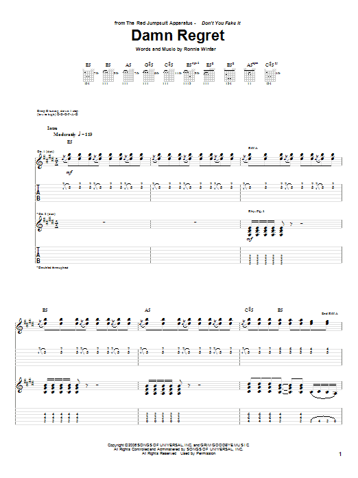 Download or print The Red Jumpsuit Apparatus Damn Regret sheet music, chords and digital score arranged for Guitar Tab. This Pop score includes 6 page(s).