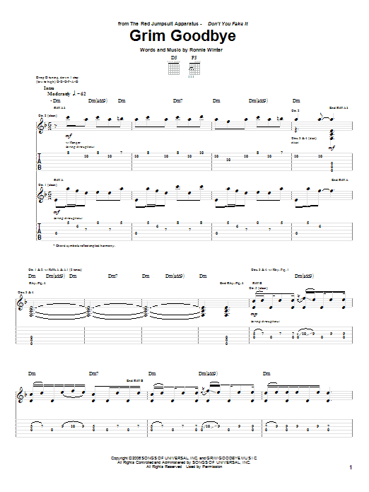 Download or print The Red Jumpsuit Apparatus Grim Goodbye sheet music, chords and digital score arranged for Guitar Tab. This Pop score includes 20 page(s).