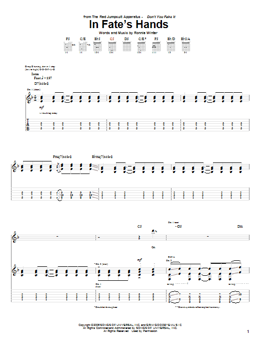 Download or print The Red Jumpsuit Apparatus In Fate's Hands sheet music, chords and digital score arranged for Guitar Tab. This Pop score includes 10 page(s).