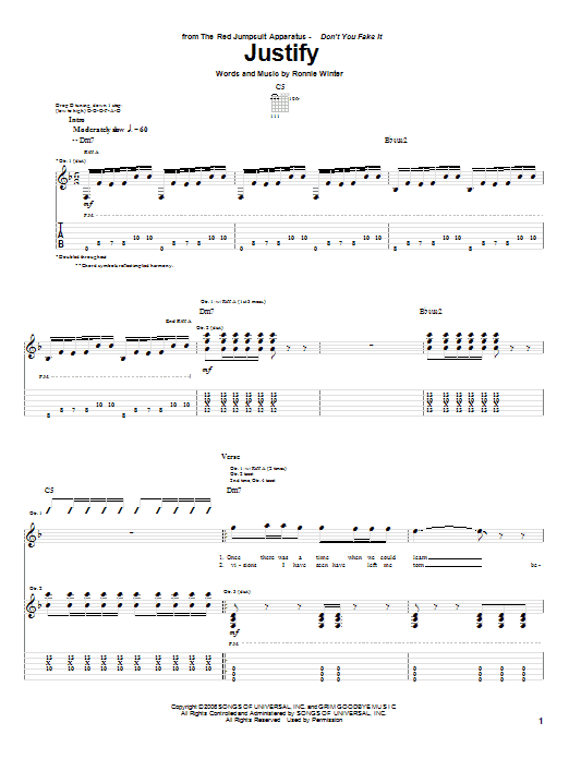 Download or print The Red Jumpsuit Apparatus Justify sheet music, chords and digital score arranged for Guitar Tab. This Pop score includes 7 page(s).