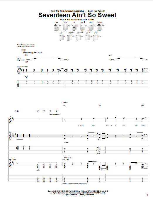 Download or print The Red Jumpsuit Apparatus Seventeen Ain't So Sweet sheet music, chords and digital score arranged for Guitar Tab. This Pop score includes 11 page(s).
