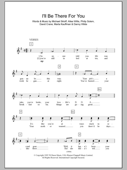 Download or print The Rembrandts I'll Be There For You sheet music, chords and digital score arranged for Piano Chords/Lyrics. This Film/TV score includes 2 page(s).