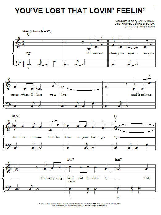 Download or print The Righteous Brothers You've Lost That Lovin' Feelin' (arr. Phillip Keveren) sheet music, chords and digital score arranged for Easy Piano. This Film/TV score includes 4 page(s).