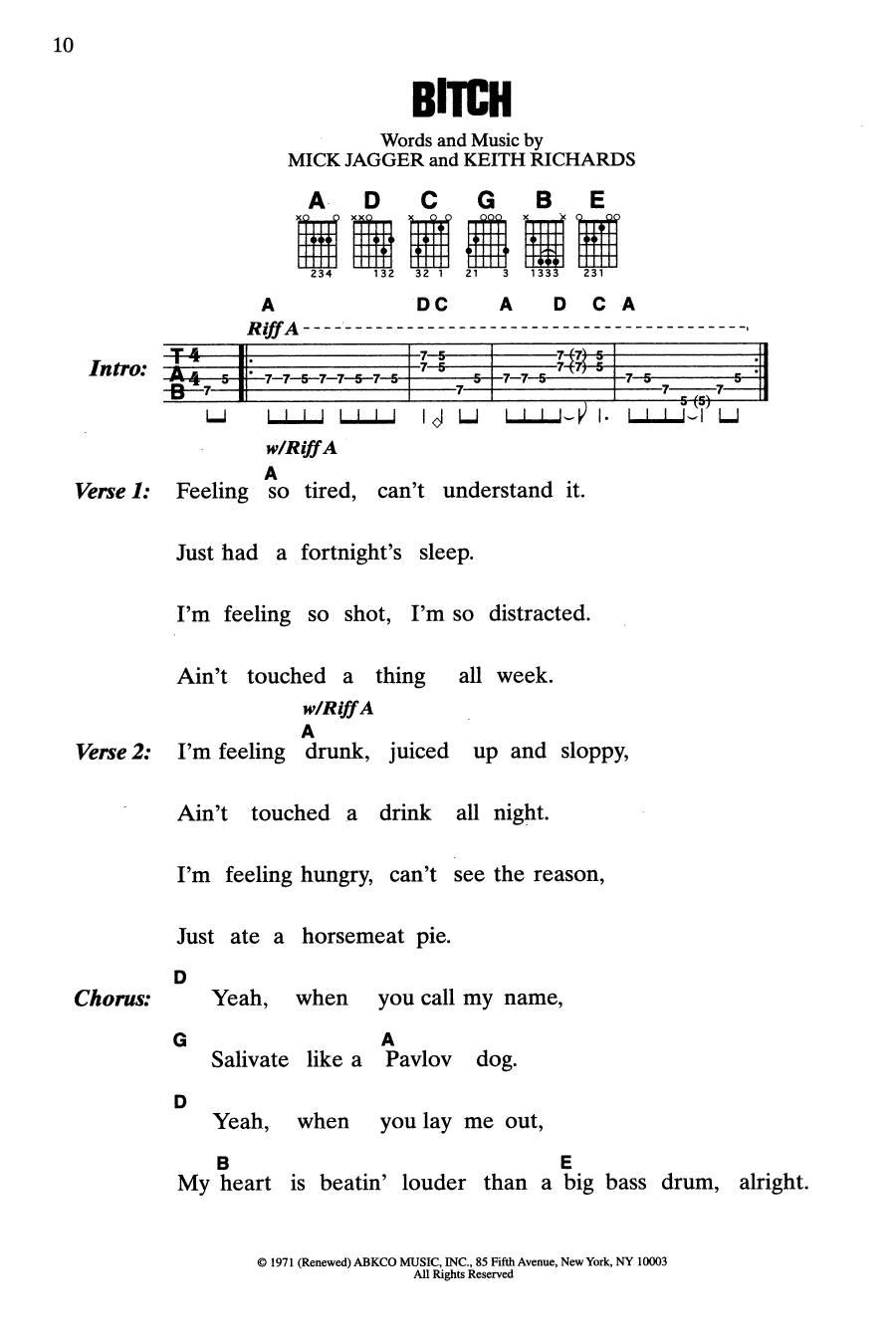 Download or print The Rolling Stones Bitch sheet music, chords and digital score arranged for Guitar Chords/Lyrics. This Pop score includes 2 page(s).