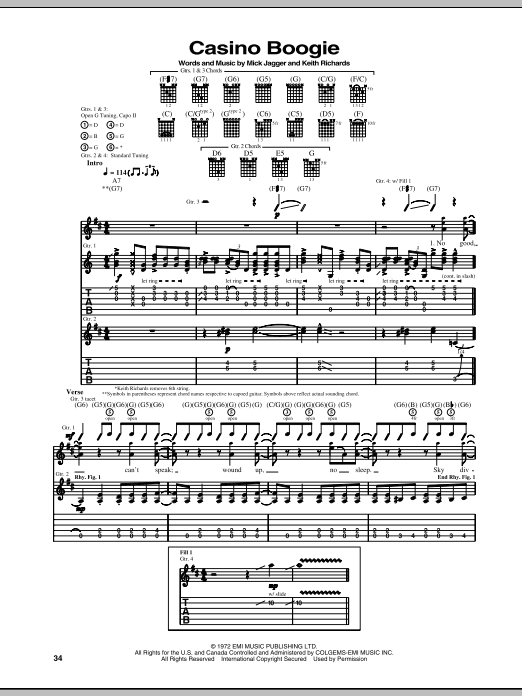 Download or print The Rolling Stones Casino Boogie sheet music, chords and digital score arranged for Guitar Tab. This Pop score includes 10 page(s).