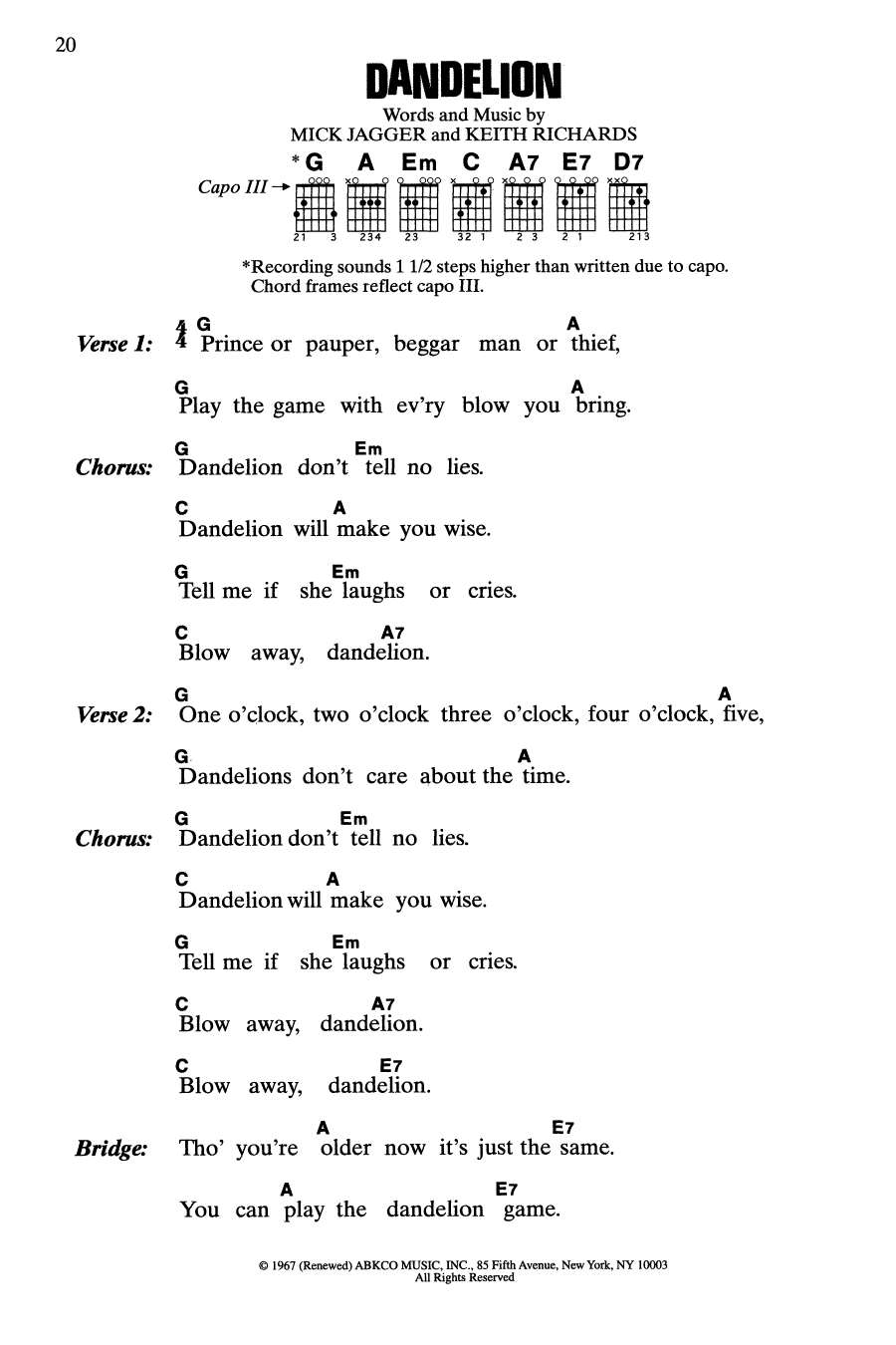Download or print The Rolling Stones Dandelion sheet music, chords and digital score arranged for Guitar Chords/Lyrics. This Rock score includes 2 page(s).