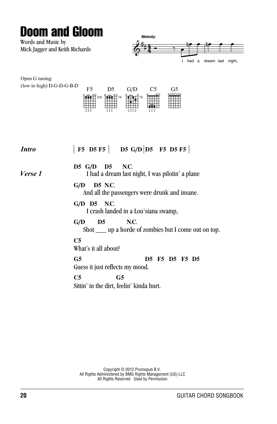 Download or print The Rolling Stones Doom And Gloom sheet music, chords and digital score arranged for Piano, Vocal & Guitar Chords (Right-Hand Melody). This Pop score includes 8 page(s).