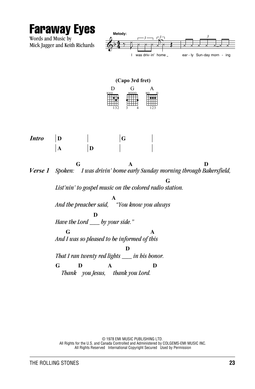 Download or print The Rolling Stones Faraway Eyes sheet music, chords and digital score arranged for Guitar Tab. This Rock score includes 13 page(s).