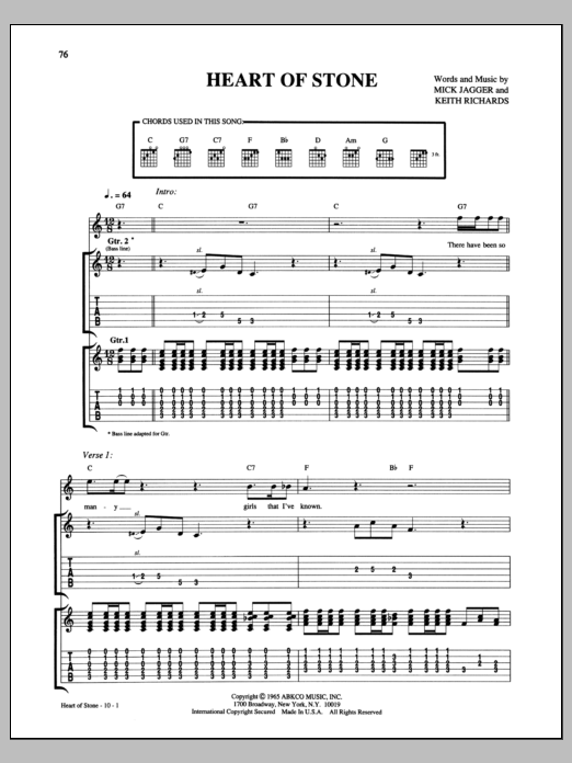 Download or print The Rolling Stones Heart Of Stone sheet music, chords and digital score arranged for Guitar Chords/Lyrics. This Rock score includes 2 page(s).
