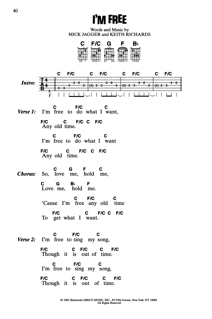 Download or print The Rolling Stones I'm Free sheet music, chords and digital score arranged for Guitar Chords/Lyrics. This Rock score includes 2 page(s).