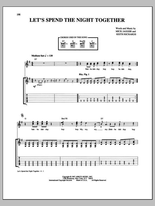 Download or print The Rolling Stones Let's Spend The Night Together sheet music, chords and digital score arranged for Guitar Tab. This Pop score includes 6 page(s).