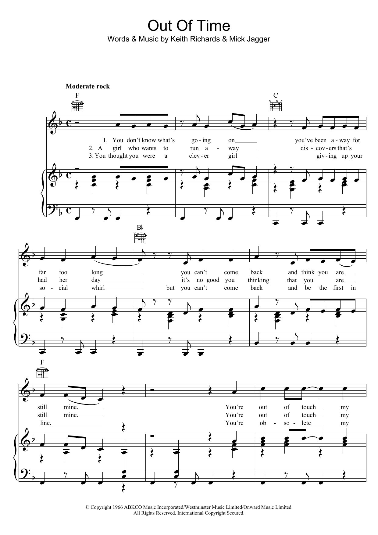 Download or print The Rolling Stones Out Of Time sheet music, chords and digital score arranged for Guitar Chords/Lyrics. This Rock score includes 2 page(s).